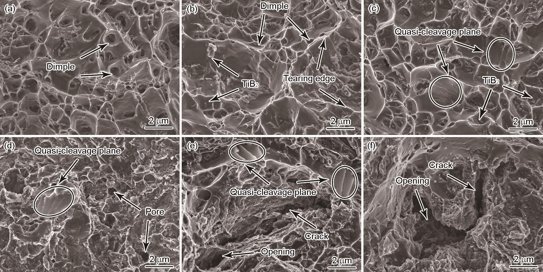 Fig.7 Fracture morphologies of hot-pressed 7075-xTiB2 composites (a) x = 0%, (b) x = 3%, (c) x = 6%, (d) x = 9%, (e) x = 12%, (f) x = 15% |