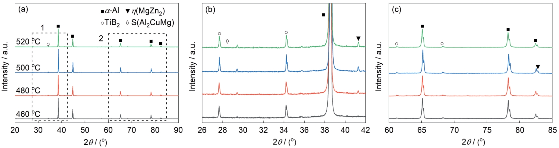 Fig.8 XRD patterns of 7075-6%TiB2 composite at different solution temperatures (a) and local magnification of box selection parts of 1 (b) and 2 (c) |