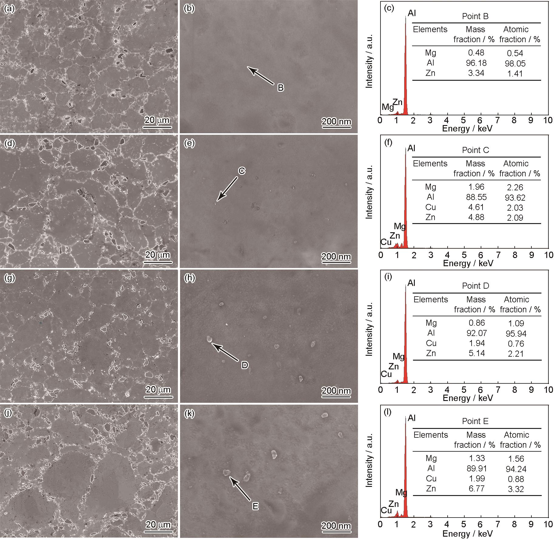 Fig.9 SEM images of 7075-6%TiB2 composite at solution temperature of 460 oC (a, b), 480 oC (d, e), 500 oC (g, h), 520 oC (j, k) and EDS analysis of points B (c), C (f), D (i), E (l) |
