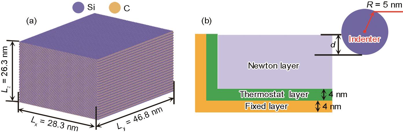 图1 β-SiC纳米滑动摩擦三维分子动力学模型 |