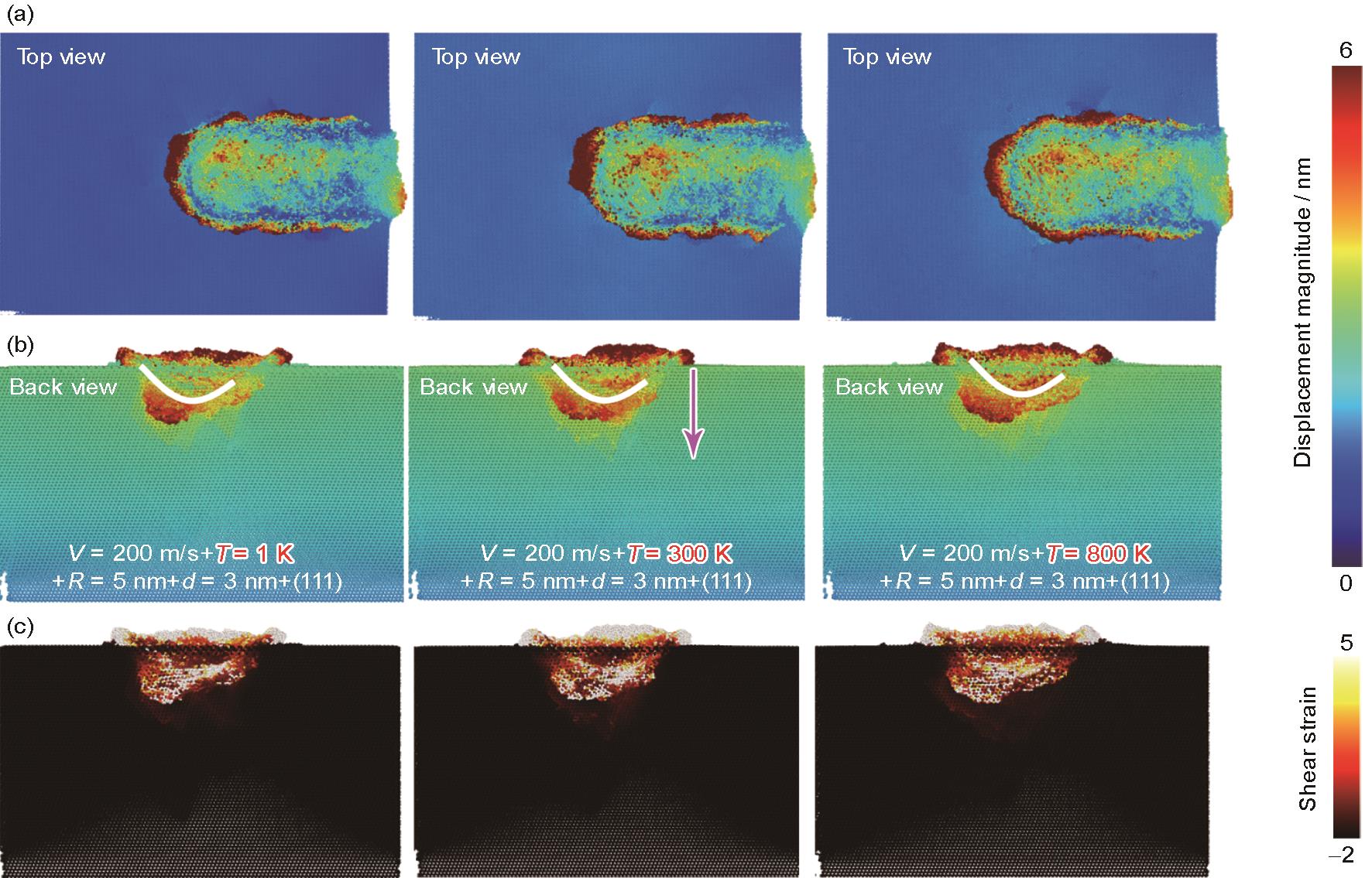 图3 温度对β-SiC纳米滑动磨损的原子位移幅度和剪切变形影响 |