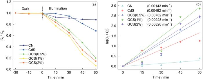 如图2所示,分别测量加入五种不同光催化剂溶液的吸光光谱。最大吸收波长峰下污染物的浓度表明,CdS的催化效率较低,而复合样品的催化效率并不随着石墨相氮化碳量的增加而增加。实验结果表明,GCS(1%)复合材料光催化效果最好。最后,根据Lambert-Beer定律