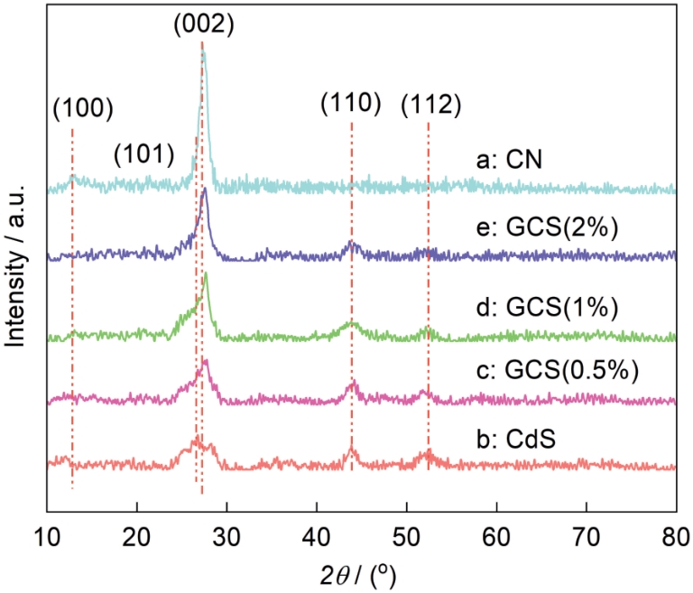 图4 CN,CdS,GCS (0.5%),GCS (1%)和GCS (2%)复合材料的XRD谱 |